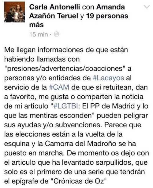 la reivindicación de la diversidad sexual y de género, pero que mientras toma algunas iniciativas interesantes como pedir a la fiscalía que investigue las declaraciones de Reig Plà, o desarrolla proyectos de colaboración con la Policía Nacional de Getafe, arropa en sus declaraciones a Esperanza Aguirre cuando critica los estereotipos que se muestran en el Orgullo y facilita la foto para el lavado de imagen, o se reúne con la Liga de Fútbol profesional después de una magnífica campaña de Arcópoli y Halegatos denunciando la discriminación y el silencio al que somete a la diversidad sexual y de género en el mundo del deporte. Y, por último, también las personas lesbianas, gais, transexuales y bisexuales deben tener cierta cautela cuando se atrevan a pensar, porque, tras aparecer esta semana un artículo de Carla Antonelli denunciando esta doble moral del Partido Popular de que venimos hablando, la propia diputada ha denunciado tener noticias de personas a las que ciertos esbirros cercanos al Partido Popular madrileño habían presionado para que no difundieran el mencionado artículo.